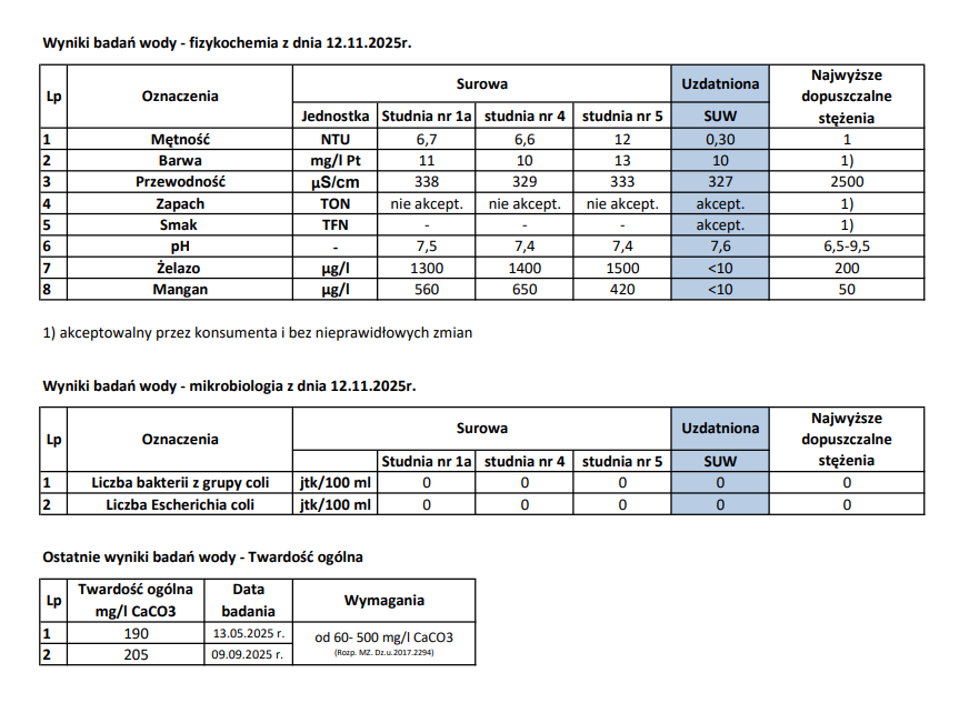 Wyniki badań wody 12.11.2025 r.